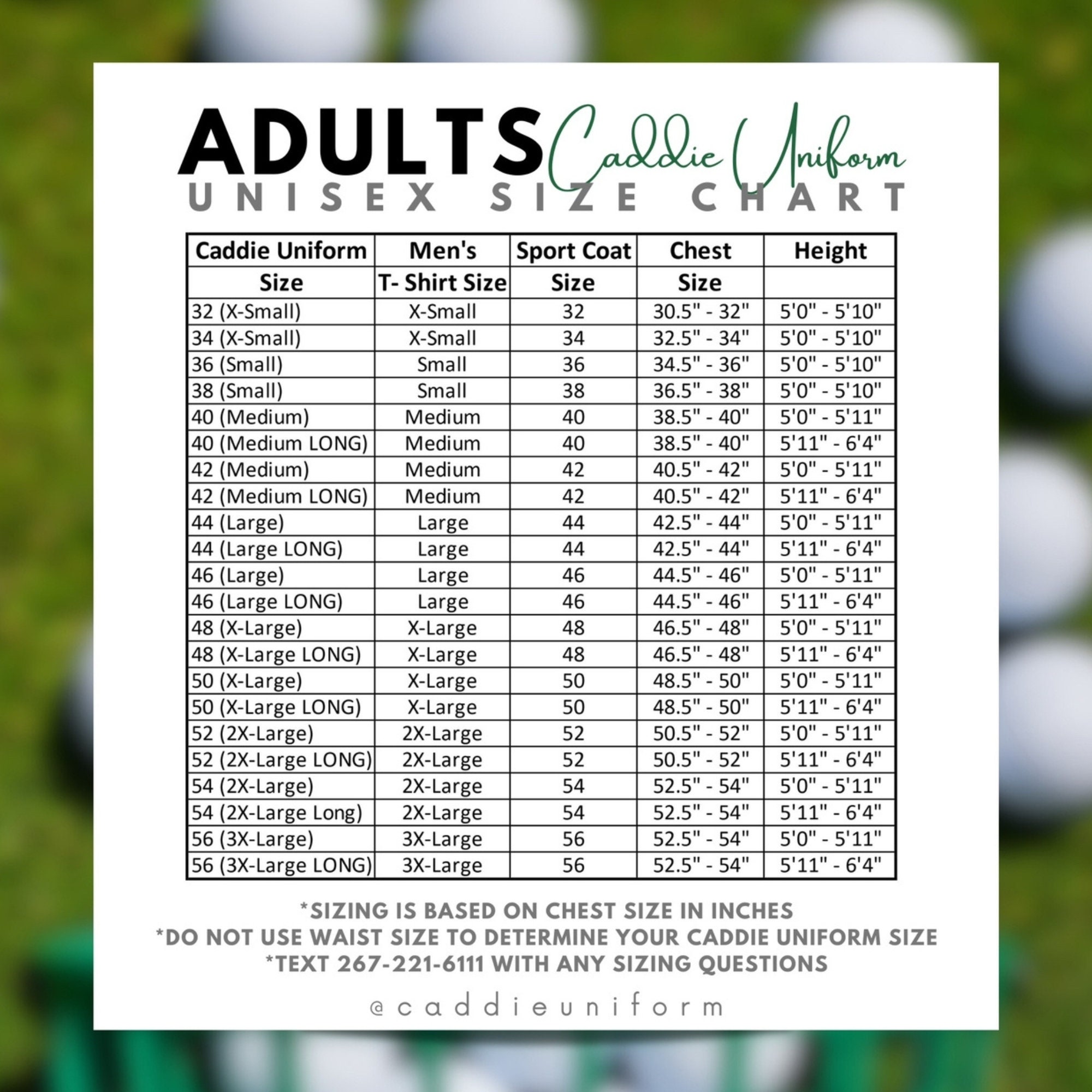 100% Authentic Custom Adult Caddie Uniform. These uniforms are perfect for Halloween, birthday parties, golf outings, family portraits, personal use, country club events and more. This uniform is made with high quality polycotton fabric. Take a look at our sizing chart for additional help for sizing.