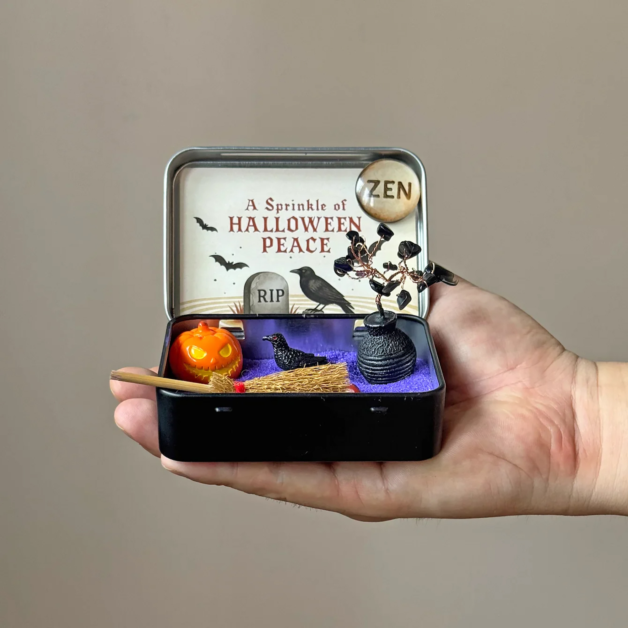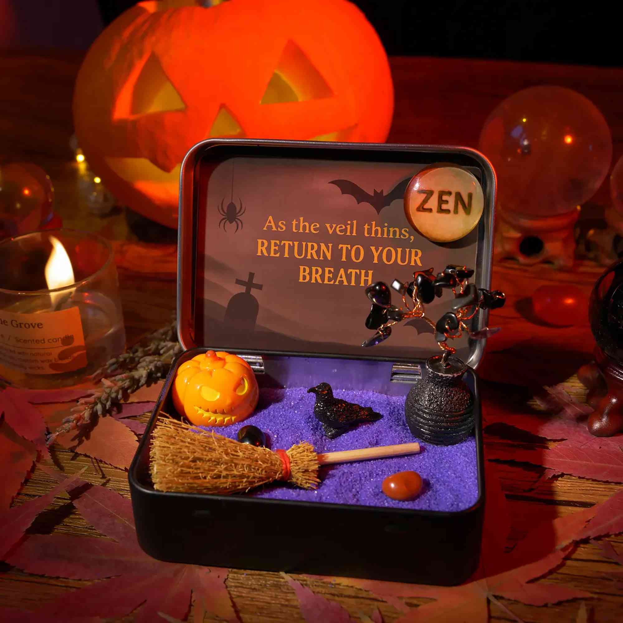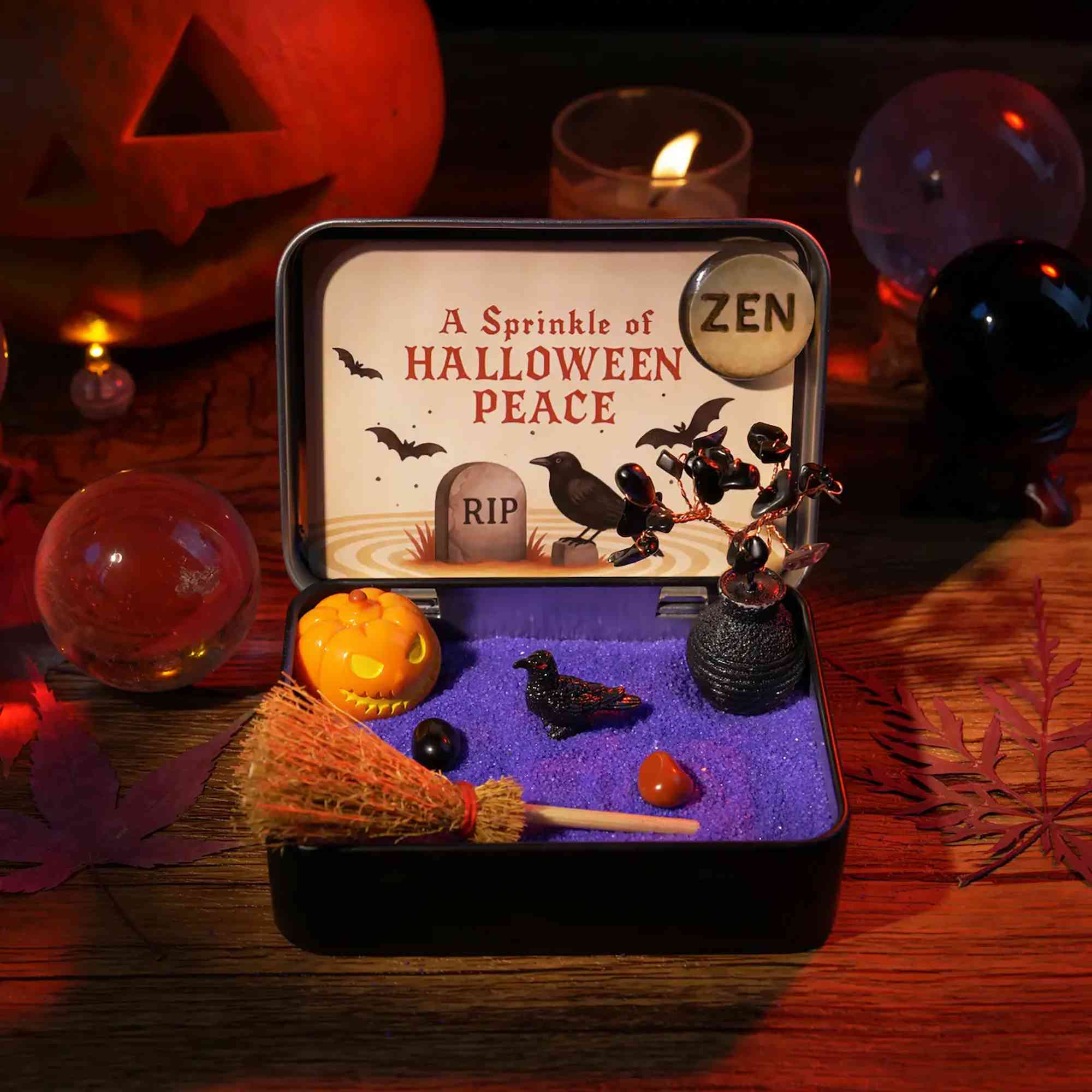Mini pumpkins, ravens, and calm Zen touches come together, blending festive charm with peaceful moments in a pocket-sized scene