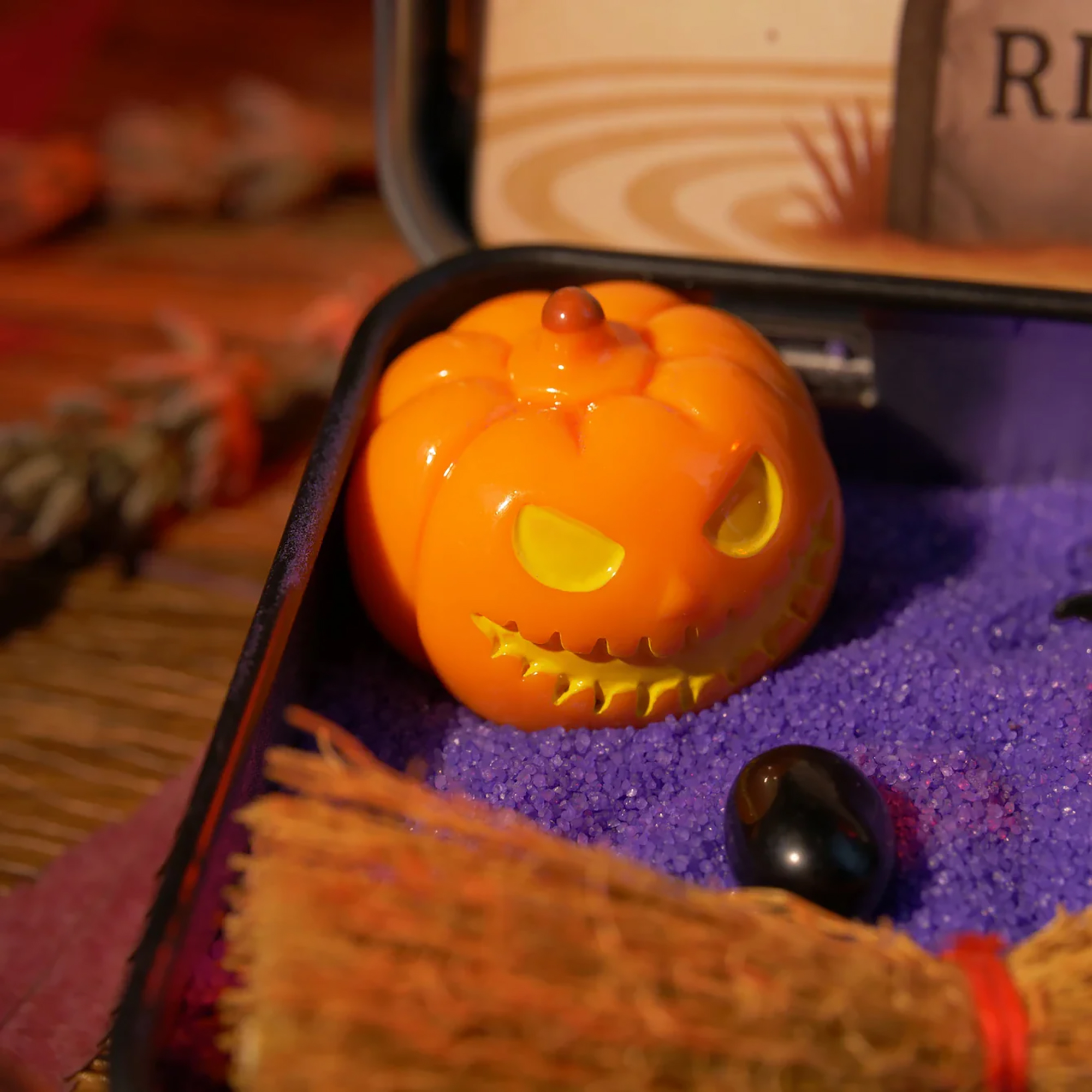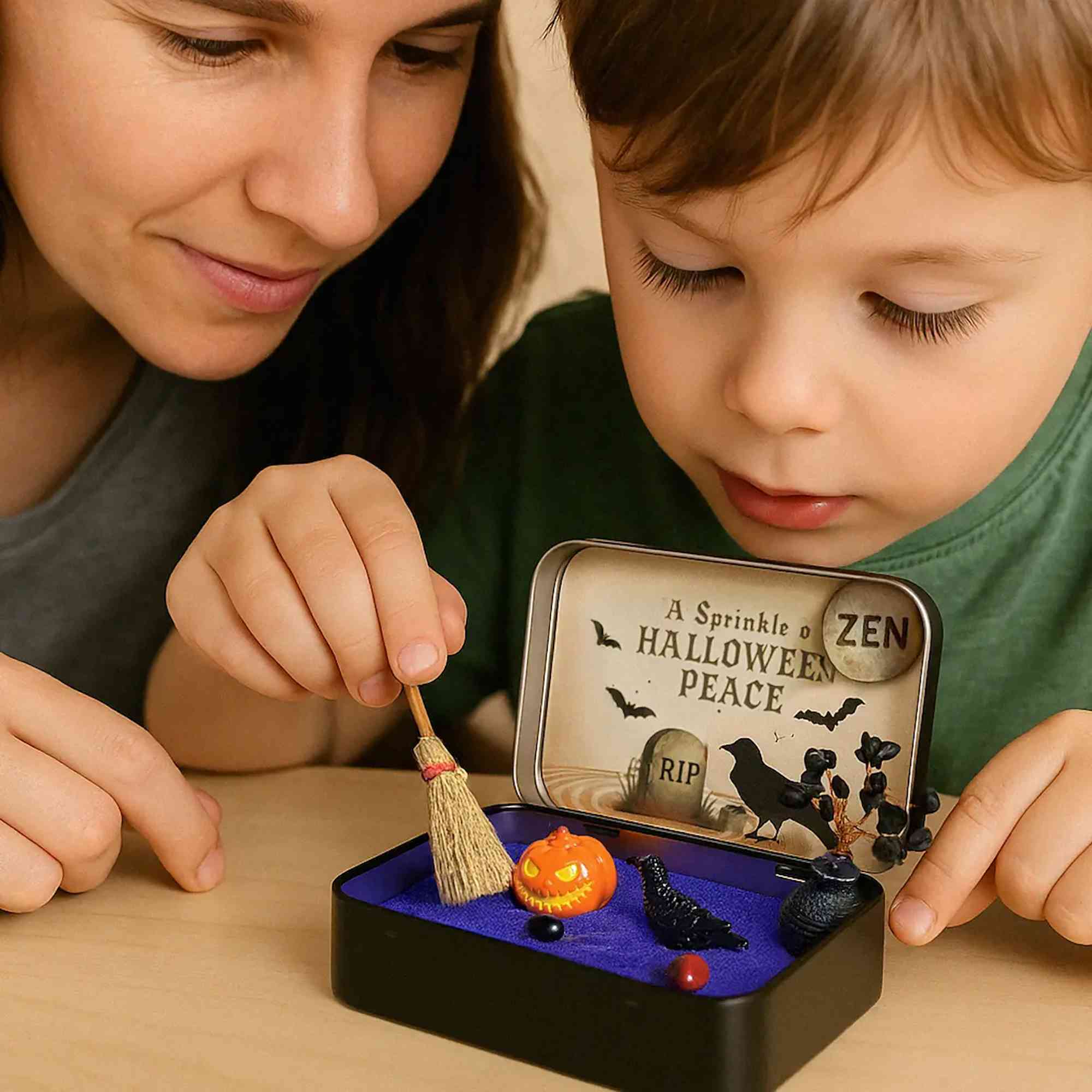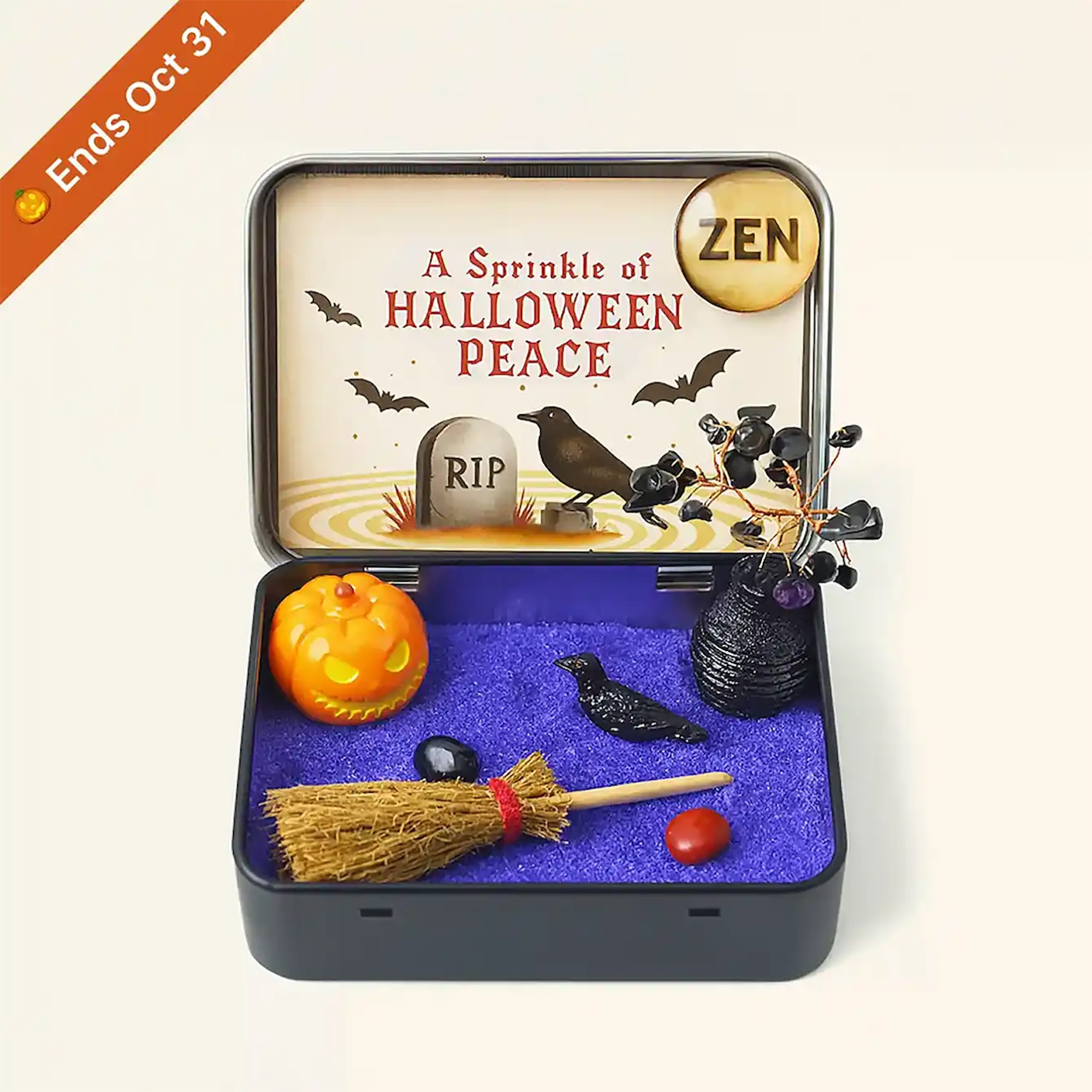 Mini pumpkins, ravens, and calm Zen touches come together, blending festive charm with peaceful moments in a pocket-sized scene
